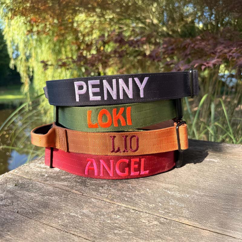 Wij naaien elke halsband op stevig, flexibel nylon, dus het kan gebeuren dat de halsband een klein beetje wiebelt of dat de letters iets scheef staan.