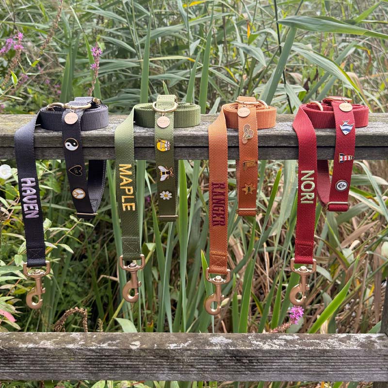 Wil je pins toevoegen? Ga dan naar de pagina Klassieke Hondenhalsbanden of Klassieke Hondenriemen en kies daar de optie ‘Personaliseer’ om je favoriete pin set toe te voegen, je eigen combinatie samen te stellen of te combineren met borduring.